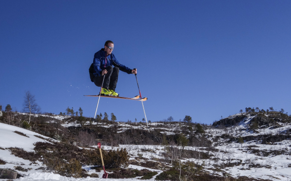Eg trudde ikkje det skulle bli hopprenn i år, sidan tilløpet stort sett var bart. Men Sigbjørn visste råd. Han tok ei økt med spaden, fekk ordna bakke og dro til med nokre kjempehopp. Ingen andre våga seg utfor.