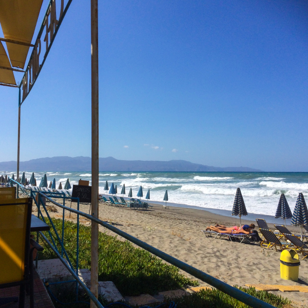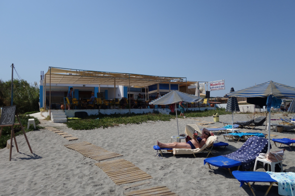 Her held vi til dei dagane vi er på stranda. Manolis leiger ut solsenger, og han har det vi treng av mat og drikke. Han pratar med gjestene, og kjenner svært mange av dei. For hit kjem folk att, år etter år. Gamle mor, som nærmar seg åtti, arbeider heile dagen, samstundes som ho er levande oppteken av at dei som sit ved borda har det bra. Ei fenomenal dame, som vi håpar å få treffe også på denne turen.