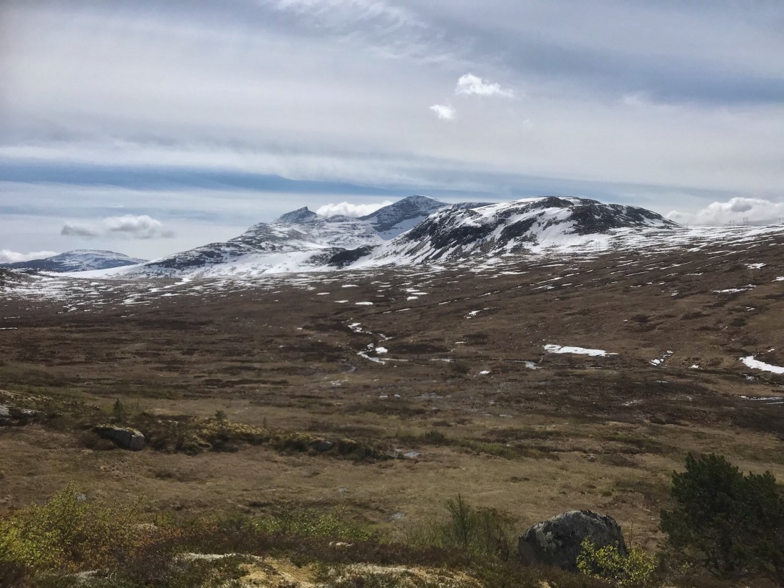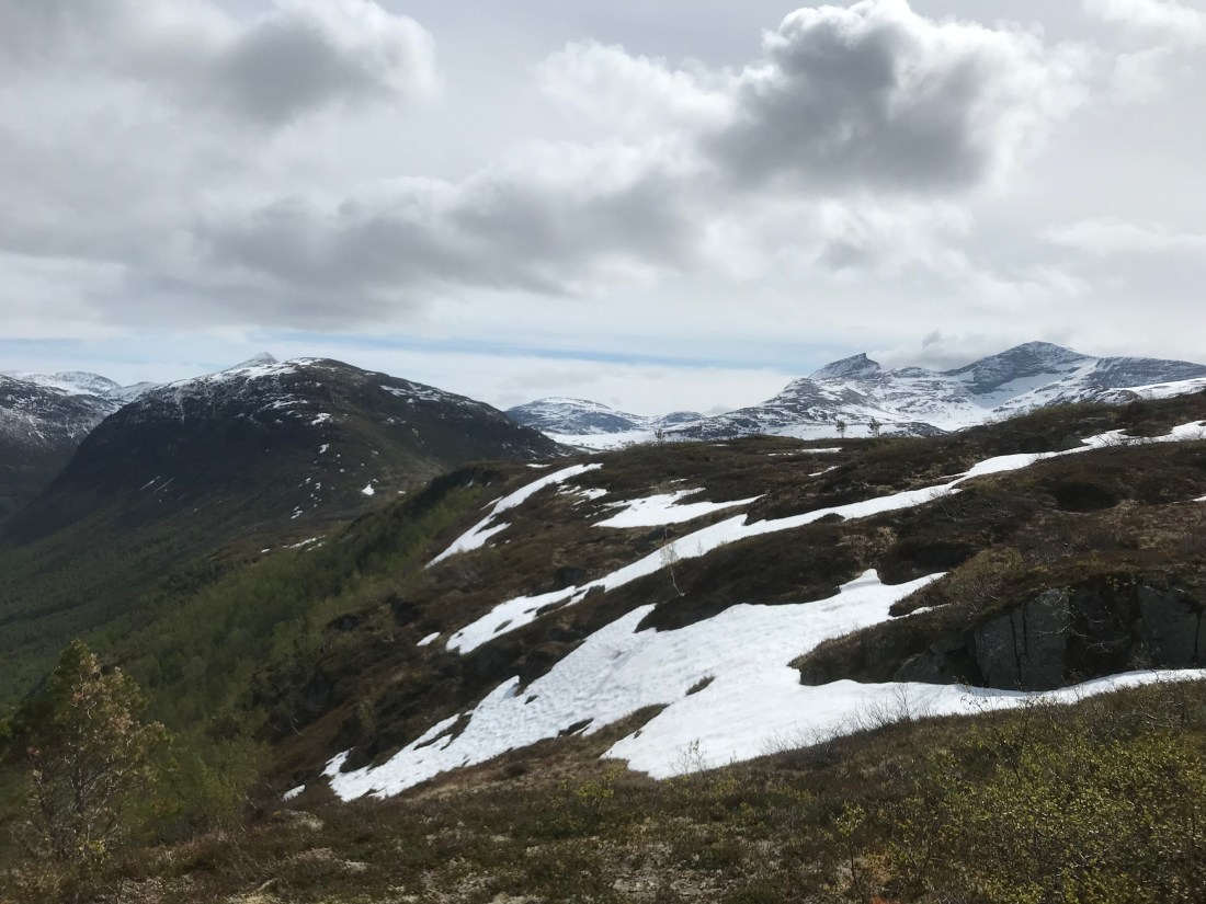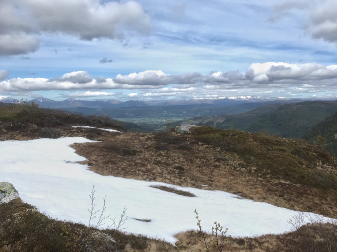 Dei siste snøflekkane er alltid seigliva. Storfjellet t.v. og snøkledde Sul-toppar t.h.