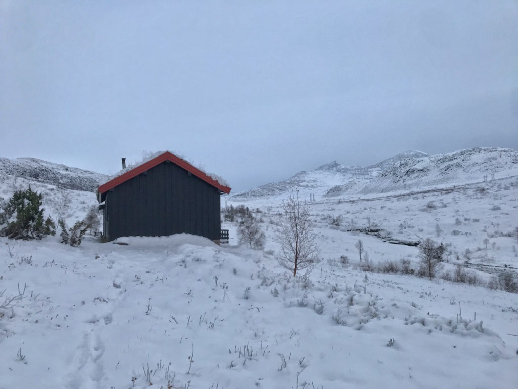6-7 centimeter med snø. 2,9 grader ute og 1,1 inne. Slik møtte Tæla meg i dag. Her oppe har vi ikkje «ring hytta varm».