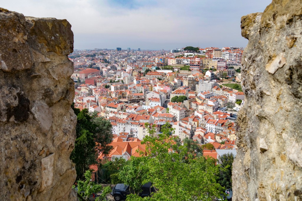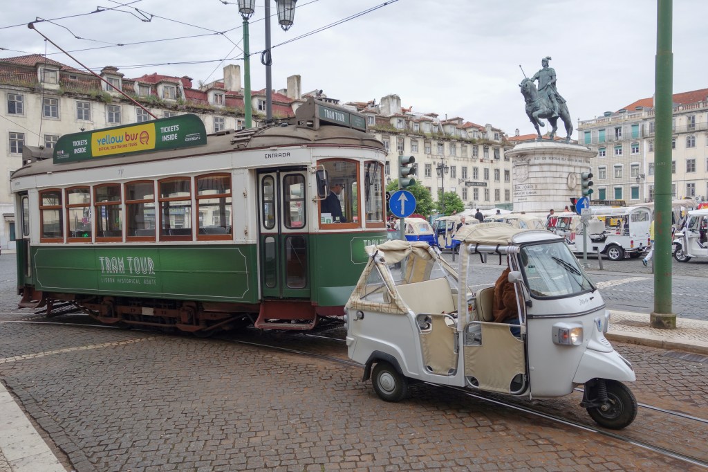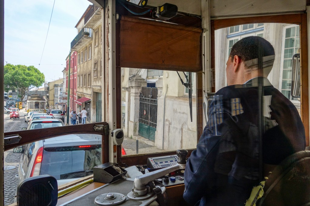 Ikkje berre bilar i Lisboa. Trikken er eit viktig framkostmiddel. Byen har fleire store katedralar. Det gjer inntrykk å kome inn i desse kyrkjeromma. I den gamle bydelen Alfama får ein inntrykk av at tida har stått stille i hundrevis av år. Kreativ utsmykking i Alfama. Ingen tur til Lisboa utan ein Fado-konsert. Fado er ei form for portugisisk folkemusikk. Trikkeføraren må manøvrere i tronge gater. Festninga Castelo de São Jorge, som tronar over byen, er frå 1100-talet. Utsikt frå Castelo de São Jorge. Lisboa er ein veldig vakker by.