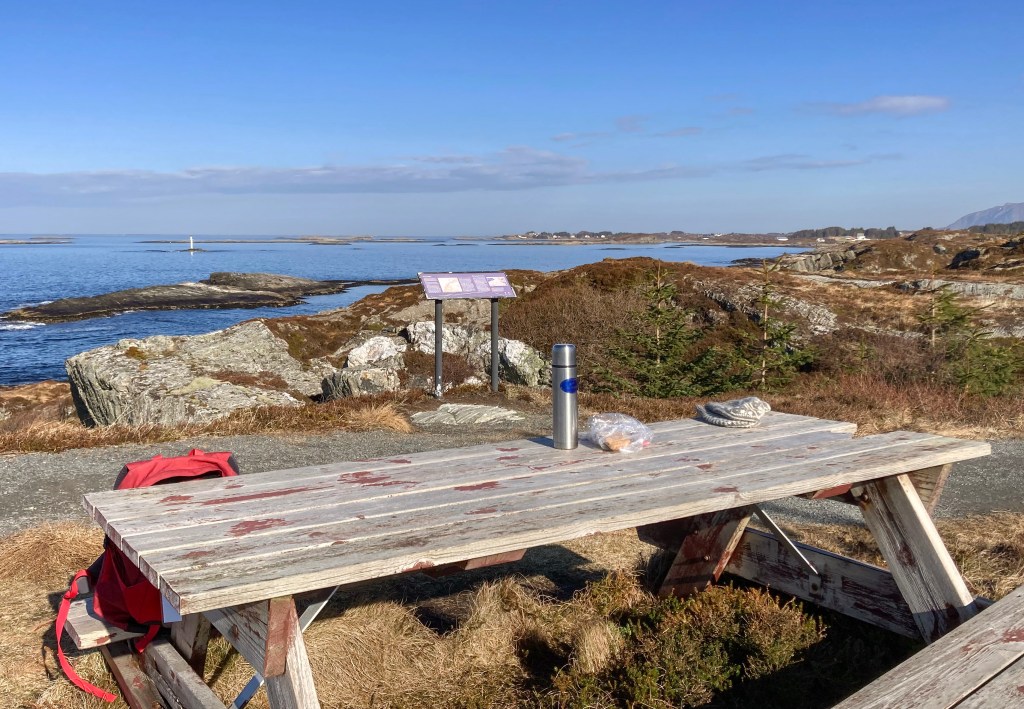 I det fine vårveret har eg funne meg ein lunsjplass med panoramautsikt mot Hustadvika. Eg er privilegert, som bur berre ein liten trimtur unna herlegdomar som dette.