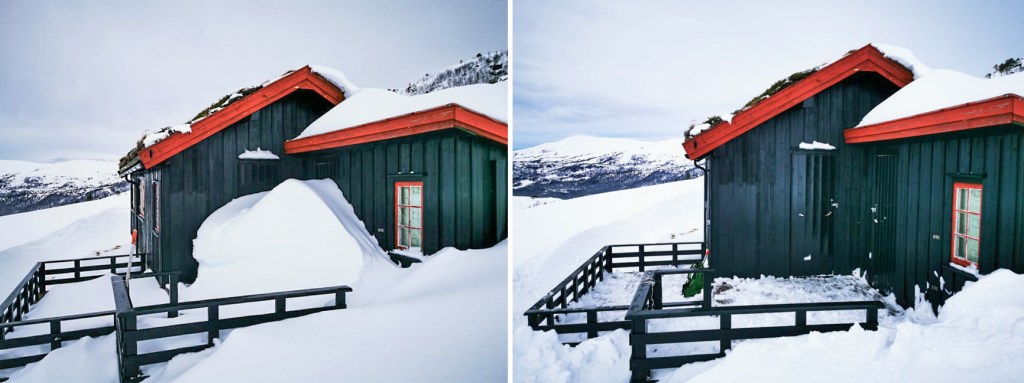 Da vi tok oss opp liene til hytta langfredag, var også det etter fleire dager med kraftig snøfall. Hyttenabo Bjarne hadde sendt bilde frå verandamåking i Telheim – heilt tydeleg eit storarbeid, så eg var mentalt førebudd på ein skikkeleg jobb da vi kom fram til hytta.