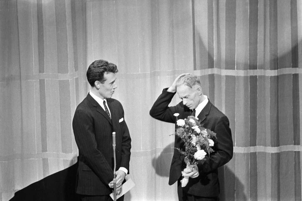 Per Lønning saman med programleiar Knut Bjørnsen etter at toppremien var sikra. Bilde er høyrer til i Dagbladet sitt negativarkiv, som Norsk Folkemuseum overtok i 2003.