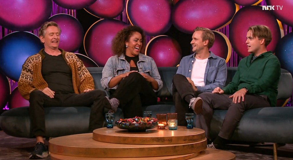 Kjendisar som ler av kvarandre i programmet Kåss til kveld. (Skjermdump frå NRK TV).