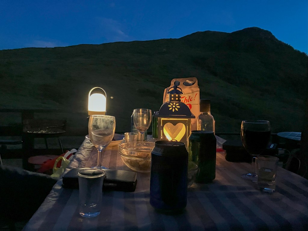 18. august kl. 22.38. Mørket sig på i augustkvelden. Trettiårsferiringa pågjekk utandørs nesten til midnatt, før vi trekte inn i hytta. Takk, Bjarne, for ein utruleg triveleg kveld. Lite kan måle seg med eit gammalt og godt vennskap.
