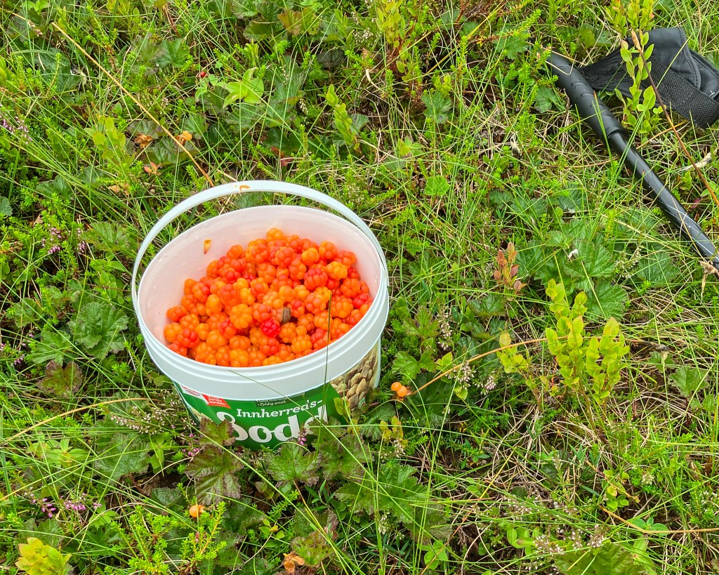 6. august kl. 13.50. Så vart det moltetur. Regnet søndag formiddag ga seg litt etter kvart. Eg fann fram eit spann, og la i veg innover Tæla. På ein GPS har eg lagt inn nokre punkt på kartet, der det finst tuer som normalt byr på molte. Det er rare greier. Kvar gong GPS’en plinga for å markere at eg var kome fram til ein molteplass, låg bæra rett framfor meg. Ikkje store mengder, rett nok, men tilstrekkeleg til vårt bruk. Så må eg ile til og opplyse om at det ikkje alltid finst bær på GPS-punkta. Eg har også opplevd å kome til desse tuene og ikkje finne så mykje som ein kart. Eller for å seie det på ein annan måte: Eg har ikkje GPS med moltegaranti.