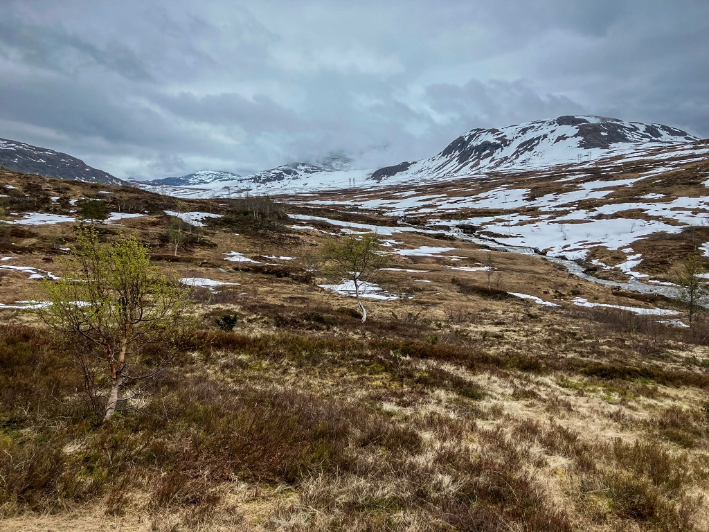 Men alt har ein ende. Siste vårskituren gjorde eg i dagane 21. – 23. mai. Som det øvste bildet viser, var skiføret nede i liene allereie borte. Men frå Dompene og fram til hytta var det såpass med snøflekker at eg kom meg fram med ski på beina. Oppe på Tæla var forholda heilt ypperlege. Etter eit fint opphald, forlet eg Tælastuå i gråver og regn. Snøen hadde minka kraftig i løpet av få dagar. Eg valde å sette at skiene på hytta.