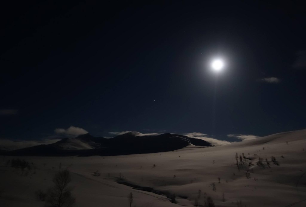 Skjærtorsdagskvelden 6. april var fullmånekveld. Bildet er tatt i halv elleve-tida. I grenseland for ein mobiltelefon, men forhåpentlegvis klarte eg å fange litt av stemninga. Det er alltid kjekt med selskap på hytta. Opplevingar som dette er det likevel ikkje noko problem å nyte åleine.