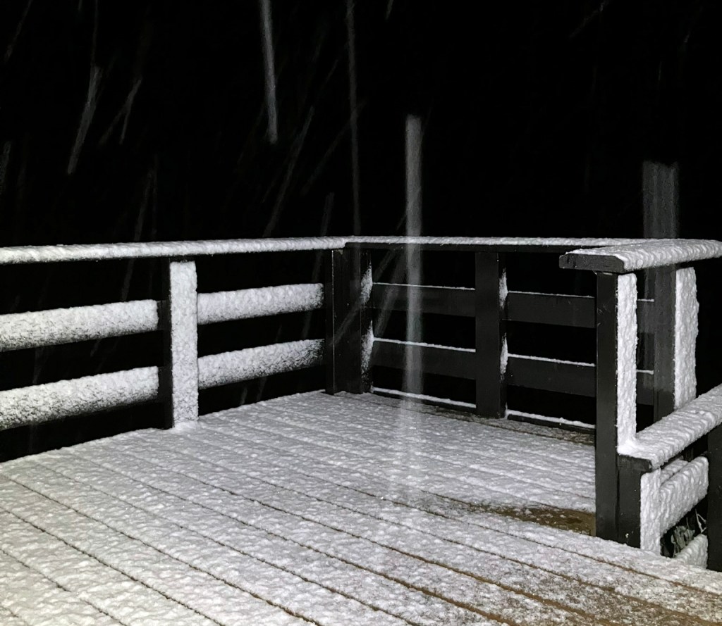 Etter at andre halvdel av september gjekk med til ein etterlengta ferie på Kreta, bar det til fjells igjen. Da eg kom ut på verandaen i åttetida om kvelden 11. oktober, vart eg møtt av dette synet. Snøen lava ned, og varsla om at kaldare tider var i emning. Neste dag var det kvite teppet borte. Slik er det som regel på denne tida. Snøen kjem og går, før den legg seg for godt.