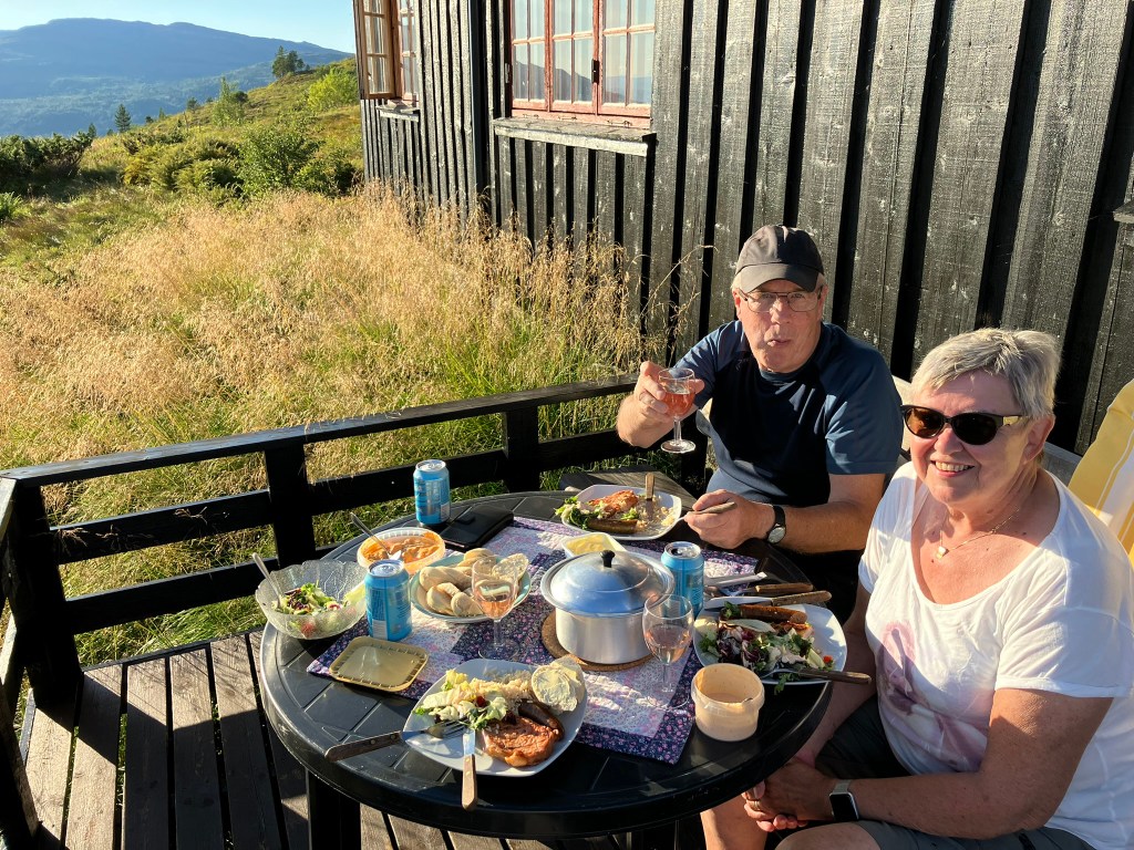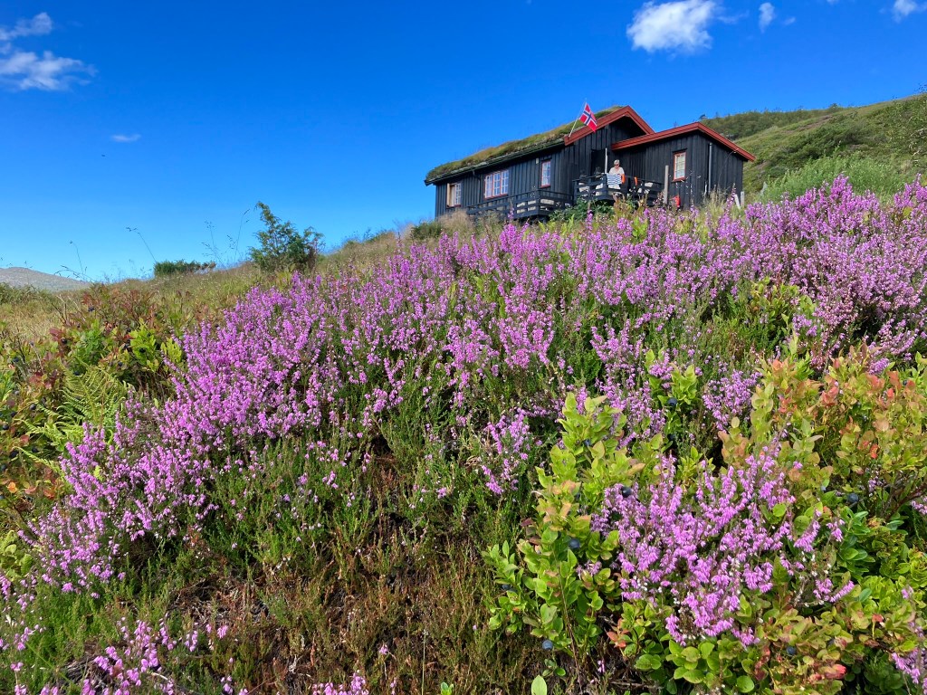 Begge bilda over er minne frå 18. august. Det øvste viser røsslyngen si fargeprakt, medan vi nedanfor har hamna i eit forseinka trettiårsjubileum. I 1992 tok Bjarne over Telheim og vi Tælastuå. Material og utstyr til begge hyttene vart frakta opp med helikopter i august. Eit år på overtid vart det endeleg tid til å feire. Vi kosa oss til langt ut i dei små timar.