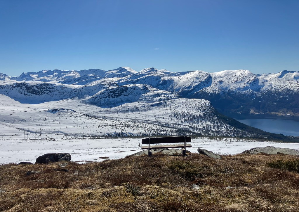 Utover våren vart det fleire skiturar til Tæla, dei fleste velsigna med fint ver. Panoramabildet er tatt 17. april, og det nedanfor to dagar seinare. Eg likar å legge turen til Skarvan, uansett årstid. Etter at Gunnar sette opp den fine benken der, har dette utsiktspunktet vorte eit enda meir fristande mål. Tydelegvis er det fleire enn eg som meiner det same. Dei mange skispora viser at benken har ført til auka trafikk på Skarvan.