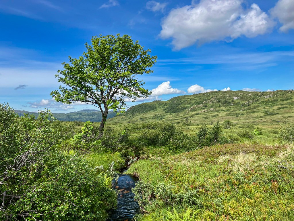 Denne rogna står inne på Tæla eit stykke heimafor lina. Ho er ikkje så ruvande av vekst, men gjer likevel såpass av seg i det opne landskapet at ein kan kalle ho eit landemerke. Eg kan sjå det karakteristiske treet frå hytteglaset. Dette bildet er frå 24. juli, medan Tæla var på sitt aller frodigaste. Bekken i framgrunnen er ein av dei mange som til slutt utgjer Fossåa, den vakre fjellelva som set punktum for si ferd mot Søya med Engjafossen.