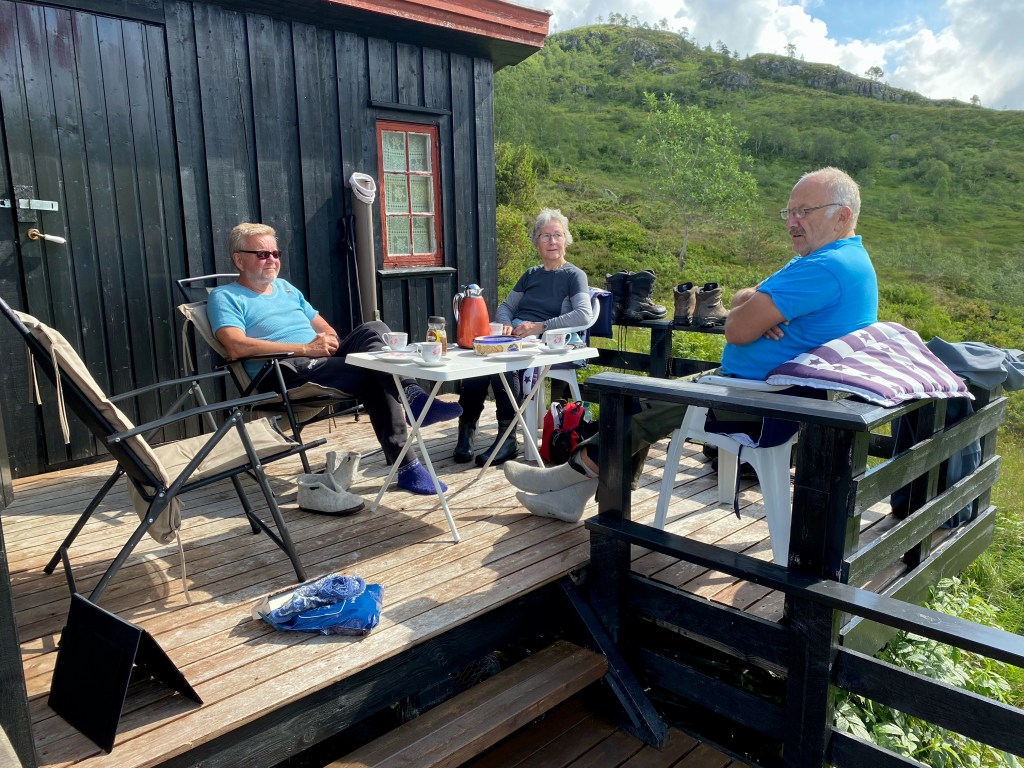 Det er alltid kjekt med besøk. 28. juli dukka Mary og Lars Gudmund opp. Det vart kaffelag og triveleg prat. Gjestane er ivrige fjellfolk, som dyrkar hyttelivet i Skaråsen på autsida av Kvenndalen (Foto: Mette).