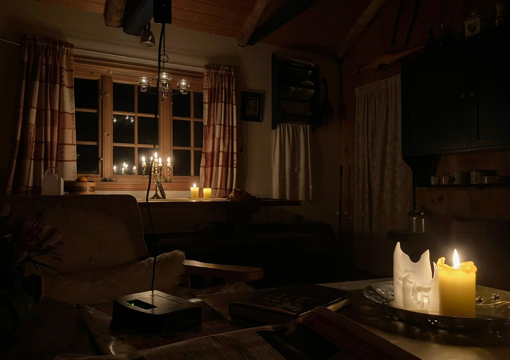 Eg mørknar ned på Tæla første kvelden for året. Det er nesten magisk. Stillheit, fred og ro. I stunder som dette brukar eg minimalt med lys i hytta. Som diktaren Hans Børli seier det: «Den som går med løkt i mørket, ser ikke stjernene».