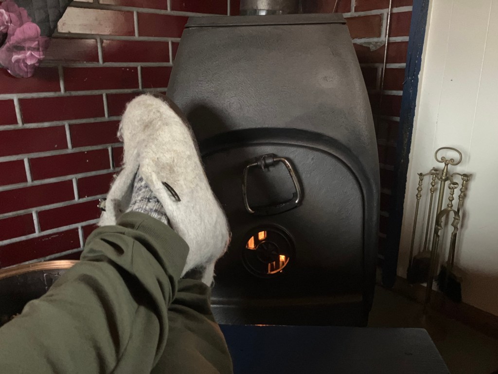 Ut på ettermiddagen kunne eg tenne opp. Vel nøgd med dagens innsats rigga eg meg til ved omnen, med radio, ei fersk avis og eit glas vin innafor rekkevidde.