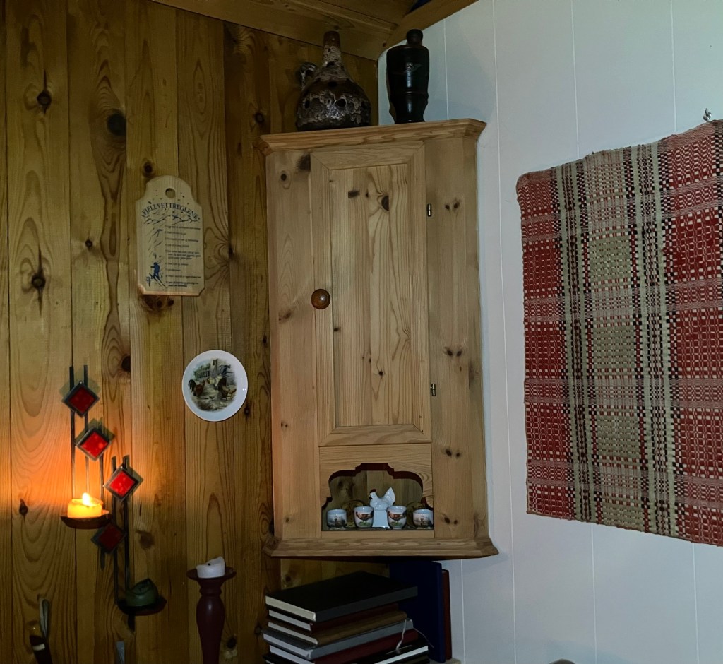 I kveld kom eg til å tenke på korleis kråskåpet som heng på veggen kom hit. Skåpet er laga av Tønnes Kvendbø. Vi kjøpte det av sonen Ole Johan, ikkje lenge etter at Tønnes gjekk ut av tida. Eg hugsar handelen veldig godt. Den vart gjort i Åsheim ein fredagskveld i 1995. Hytteboka fortel at datoen var 18. august.