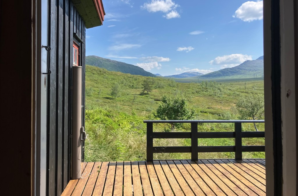 Eg har installert meg i døropninga. Her er det svalt og leveleg. Noko terrasseliv er ikkje å tenke på før sola har flytta seg lenger mot vest.