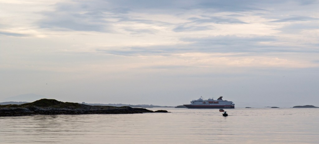 Hurtigruta glir forbi. Ho har sin eigen syklus. To gongar i døgnet kan vi som bur i Bud sjå desse staselege skipa, som har trafikkert langs kysten vår sidan 1893.