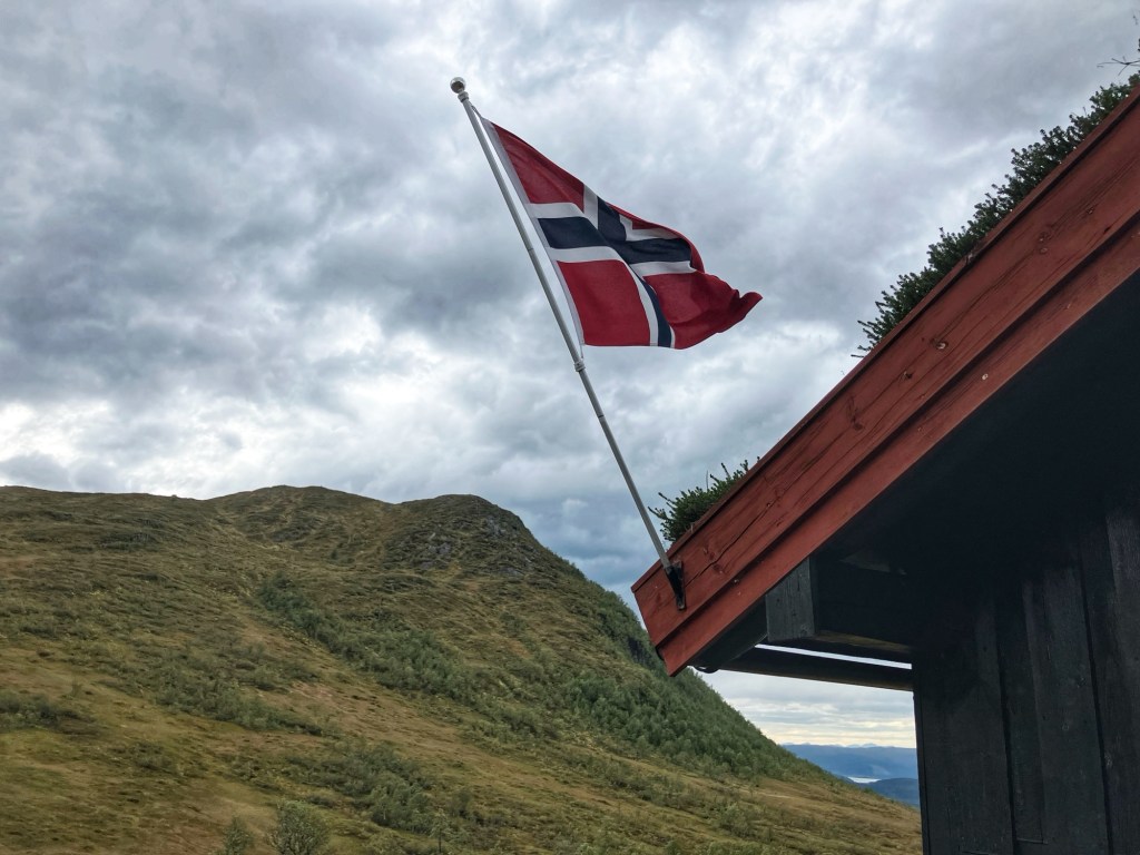 Auståvinden feier over Tæla. Det er nesten i meste laget. Eg vurderer å ta inn flagget før det bles i filler. Gradestokken viser faktisk 18-19 grader. Men dei varme gradene får ikkje høve til å stoppe på. Dei berre fyk forbi.